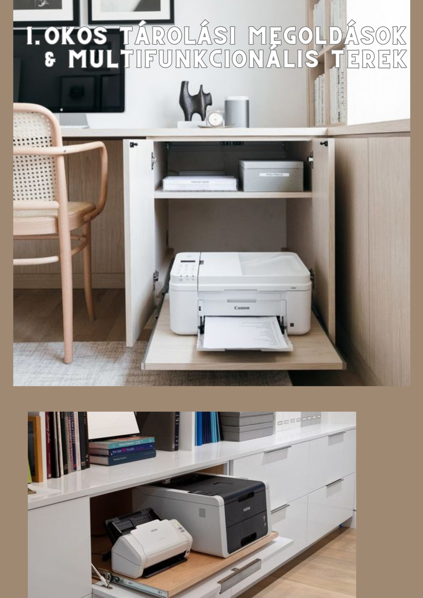 Otthoni munka esetén elkerülhetetlen a nyomtatók, szkennelők és egyéb nagy masinák használata, amik legtöbbször nem csak útban vannak, de nem is mutatnak esztétikusan az asztalon. Ezek elrejtése tisztább és organizáltabb munkakörnyezetet eredményez ami mindenképpen pozitív hatással lehet egy stresszes papírokba temetkezett napon.
