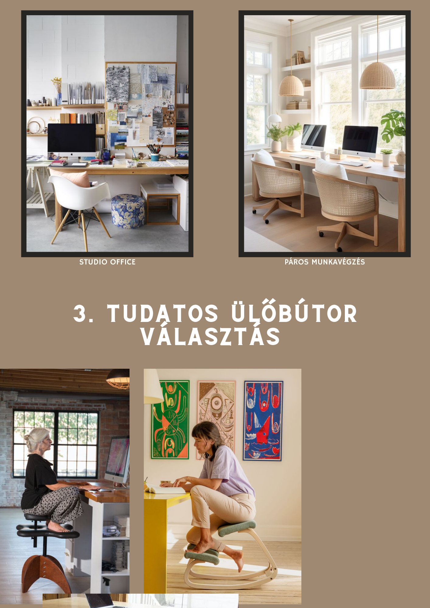 Munka folyamán akár órákig is egyhelyben ülhetünk megszakítás nélkül, ezért fel kell mérnünk milyen bútor a nekünk való az egészségünk szempontjából. Persze lehet egy trendi darab is megfelelő attól függ, mi kényelmes hosszútávon. Vannak akik alternatív módokat választanak például tartásjavító/izületkímélő széket vagy labdát.