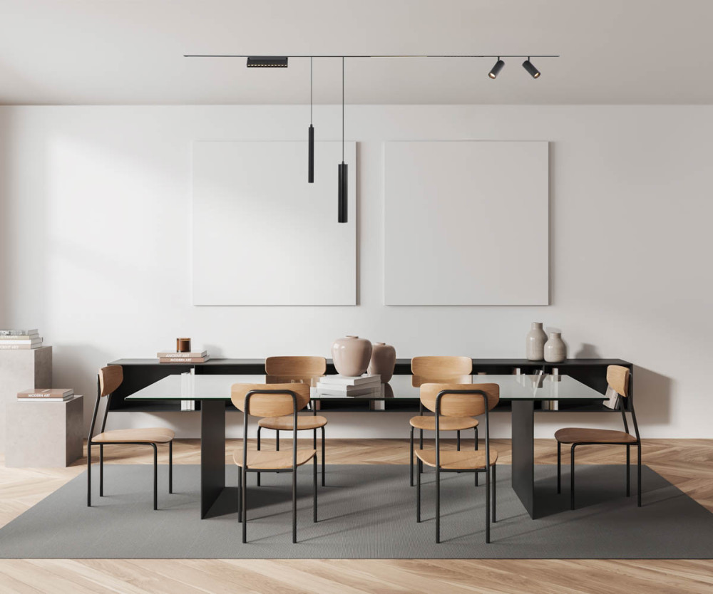 Étkező: Az étkezőasztal felett elhelyezett függeszték eleganciát kölcsönöz a térnek és kiemeli a közös étkezések fontosságát.