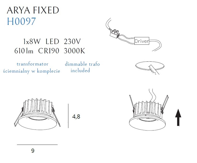 MaxLight H0097 OPRAWA WPUSTOWA MAX ARYA FIXED BLACK 8W ŚCIEMNIALNA LED IP20