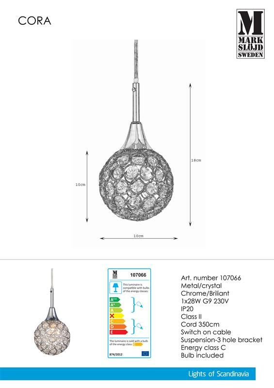 A Markslöjd CORA kristály függeszték egy ablakvilágító, amivel a skandinávok előszeretettel díszítik a lakásaikat. 3,5 méter kábellel van szerelve, amin egy zsinórkapcsoló helyezkedik el. Elegáns a géppel polírozott prizmákkal szerelt áttetsző búra.