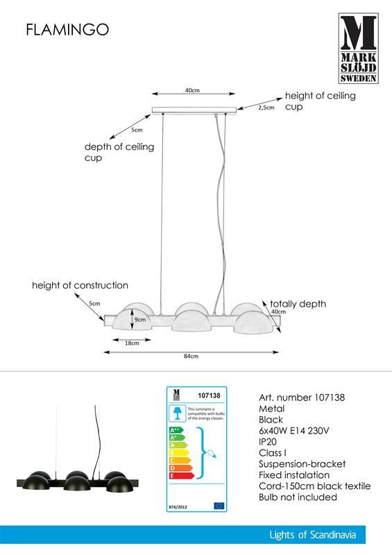 MARKSLÖJD FLAMINGO 6 ágú fekete függeszték fekete E14 6x40W, 1,5 m fekete textilkábellel szerelt, Joakim Thedin tervezése.