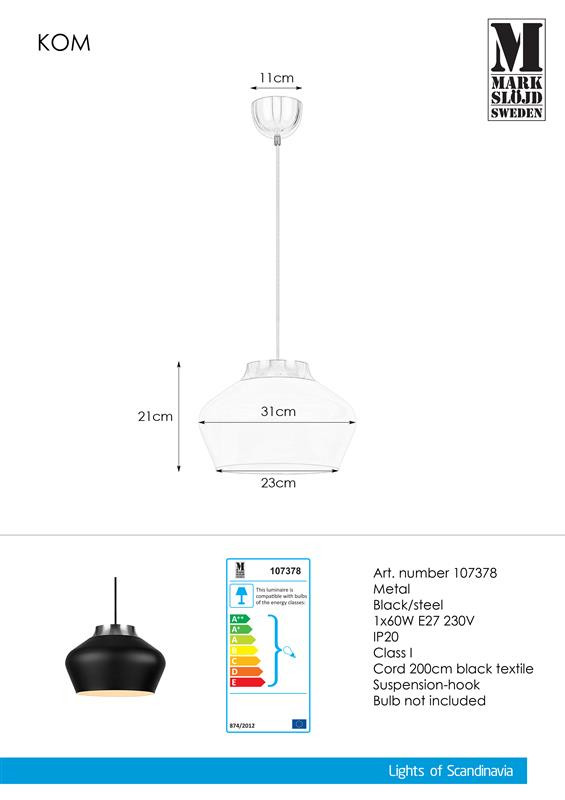 Markslöjd KOM Wisząca 31cm 1L Czarny/Stal  - MS-107378