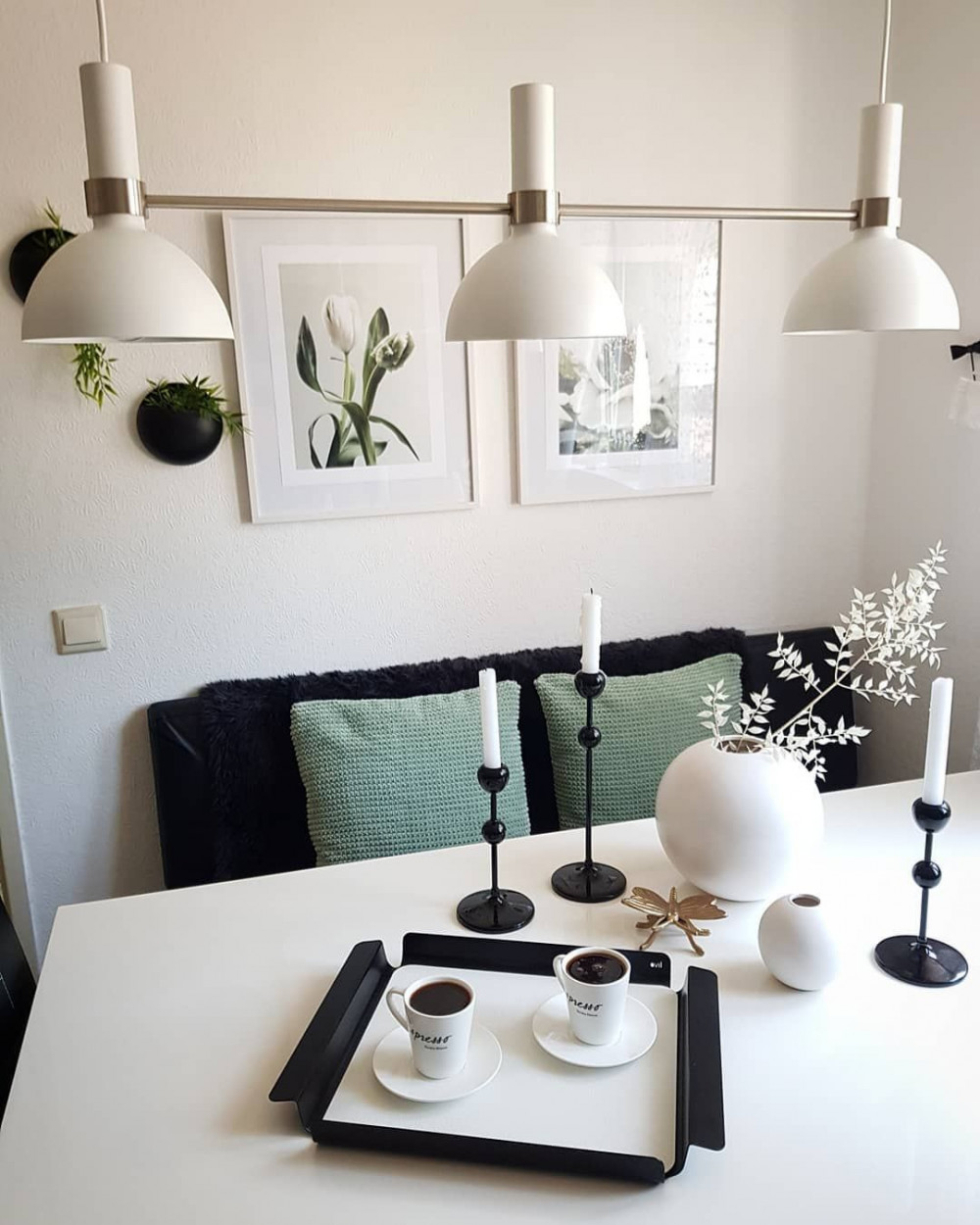 Étkező: Az étkezőasztal felett elhelyezett függeszték eleganciát kölcsönöz a térnek és kiemeli a közös étkezések fontosságát.