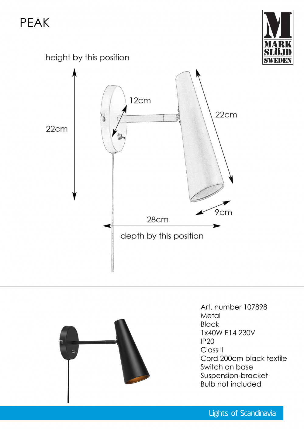 Markslöjd PEAK Kinkiet 1L Czarna - MS-107898
