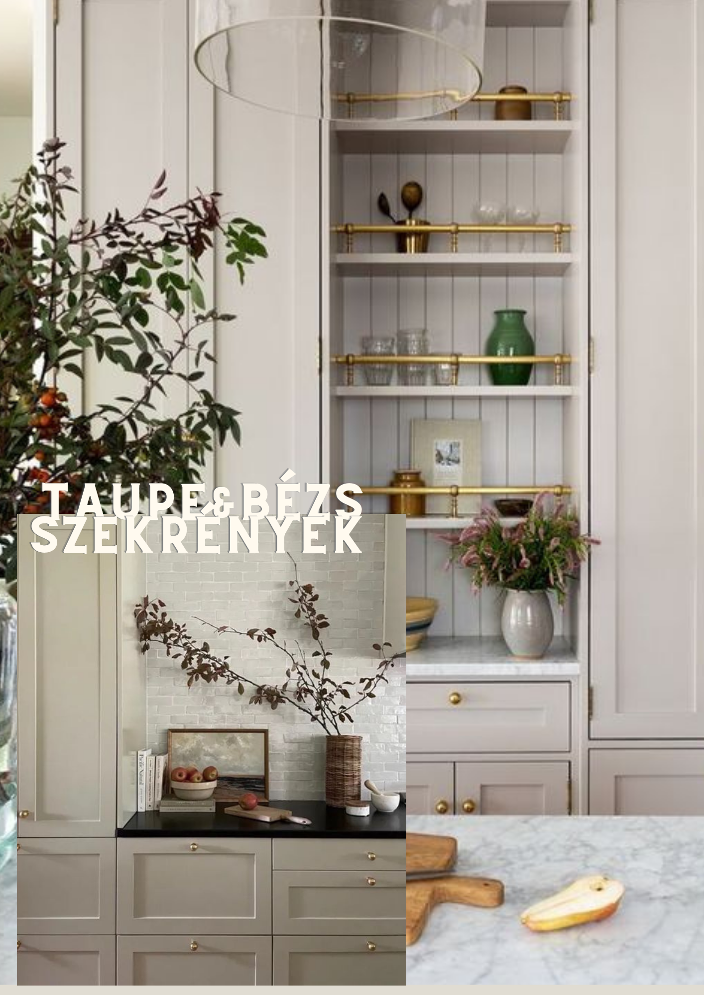 A taupe és bézs konyhaszekrények magukért beszélnek, nem véletlenül maradnak 2024-ben is. Ajánljuk arany foganytúkkal és kis beugró pakolókkal kombinálni.