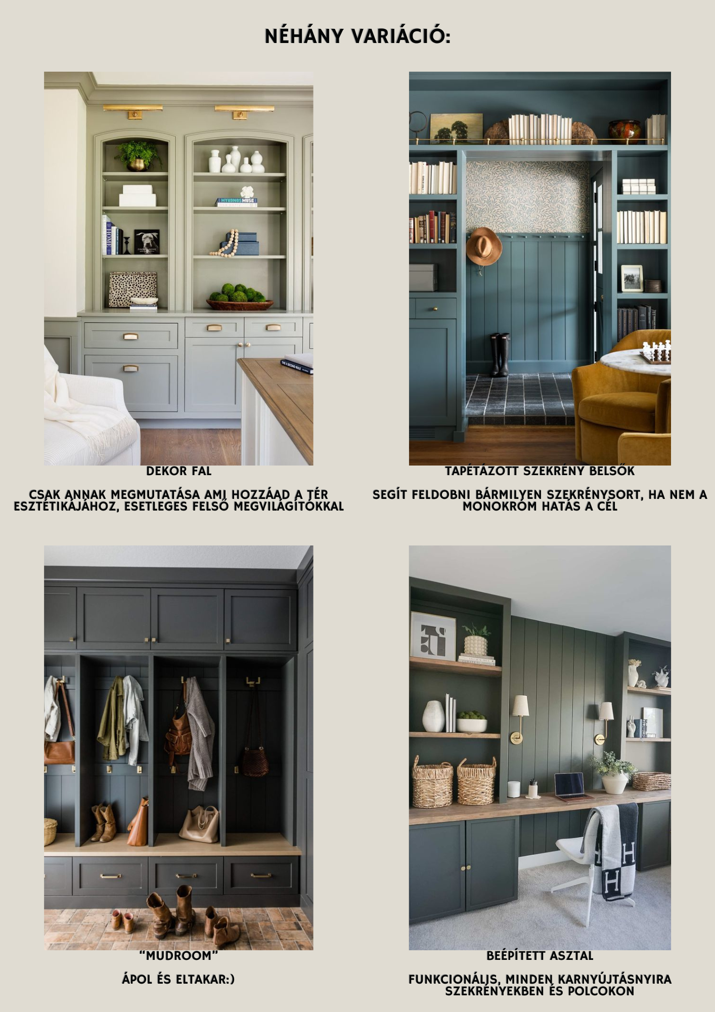 A beépített bútorok az elmúlt néhány évben ismét népszerűvé váltak. Persze nem a 80-as évek szekrénysoraitól van szó, hanem egy elegáns, és funkcionális dekor elemről, amit az évek során tökéletesítettek a tervezők. Beépített bútorok a nappaliban a legnépszerűbbek, de bármelyik szobában hasznosak ahol szükség van extra pakolóra, nem csak funkcionalitás szempontjából, de esztétikailag is eleganciát, rendezettséget és szofisztikáltságot adnak a térhez.