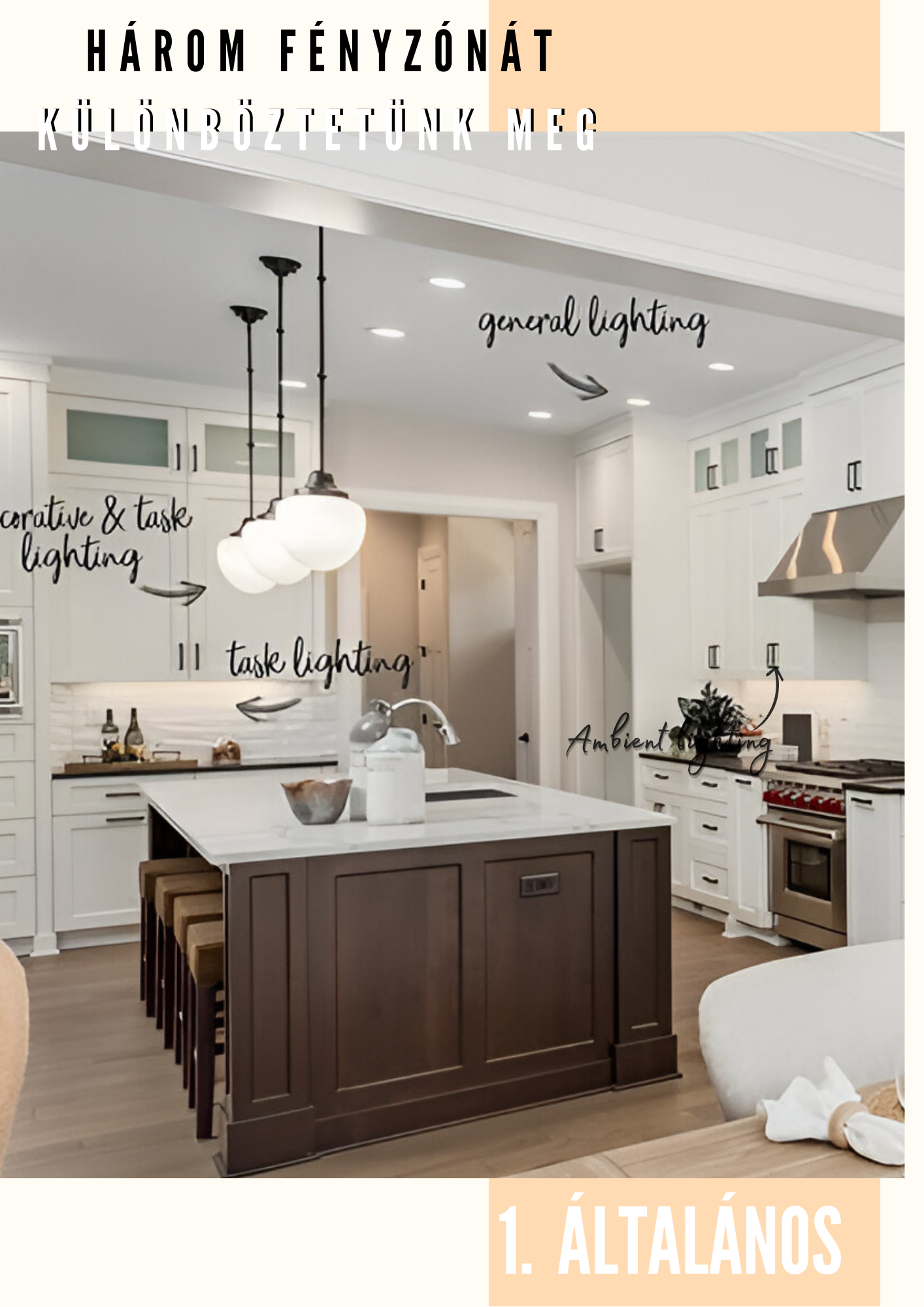 Az általános világításhoz széles sugarú fényforrást kell használni, mert az függőlegesen is terülő fény, így a szekrények nem lesznek árnyékolva. Az általános dekoratív fényforrás helye nagyon fontos, mert ha túl közel helyezzük el a szekrényekhez, fény foltokat hagy a felületeken. Fontosnak tartom megemlíteni még, hogy a süllyesztett fényforrás nem lehet a középpont, de ott kell lennie. A középpontban lehet egy vagy több dekoratív darab ami stílust és extra fényt ad a szobának, de nem marad egyedül az általános világítás szerepének betöltésében. Így egységes megvilágítást tudunk elérni az egész konyhában sötét foltok vagy kiégett felületek nélkül. Persze a természetes fény mindig a legjobb általános fényforrás, érdemes számolni vele ha kivitelezhető!