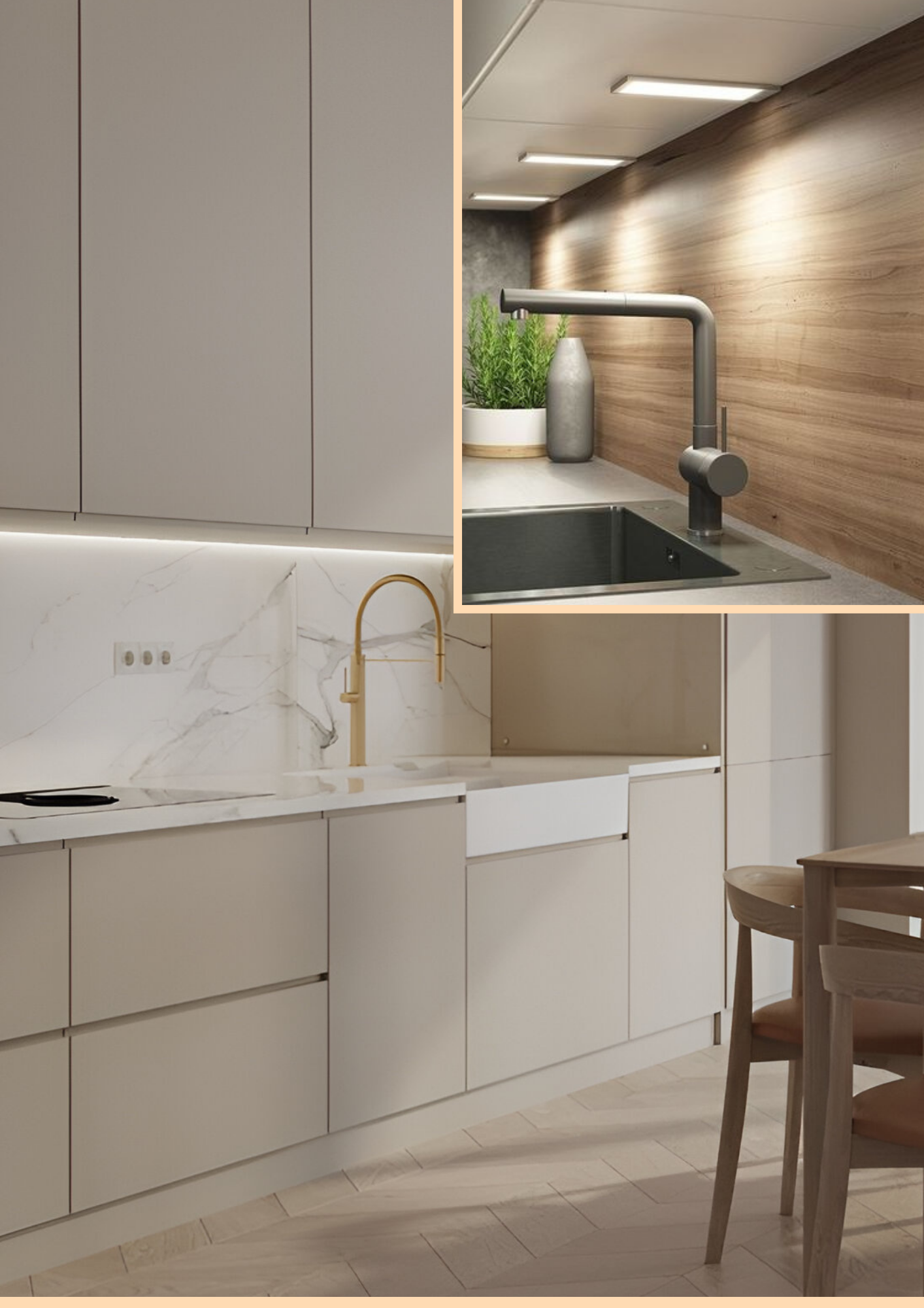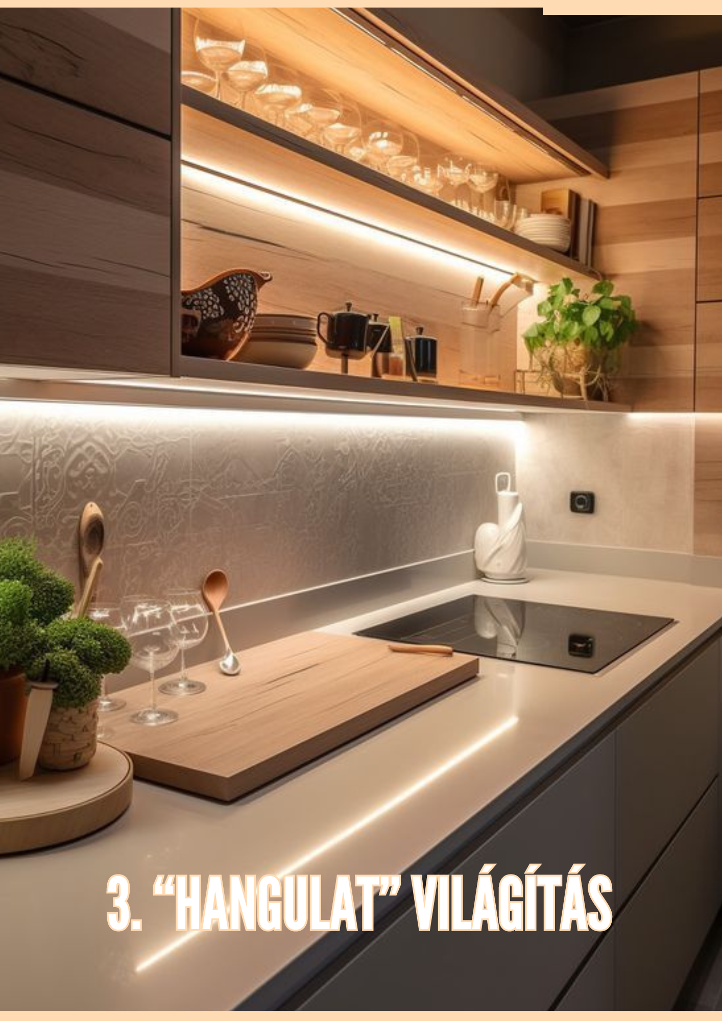 A helyes világítástervezés harmadik szakasza a hangulat világítás. Ebbe a kategóriába soroljuk a dekoratív és hangulati célt szolgáló fényforrásokat, ide tartozik a szekrények belső megvilágítása is. Ismét kiemelkedően fontos, hogy egyenletes módon terjedjen a fény mindenhova. Hogyan lehet ezt elérni? Egy folyamatos, megszakítás nélküli fényforrás használatával. Hiba olyan spotok használata amik csak a polcot kívülről világítják meg nem a tartalmát, és a szekrény alatti helytelen spot világítás fényfoltokat eredményezhet, nem egyenletesen világított csempefalat (vagy plafont ha valaki azt preferálja hangulat világításra). A szekrény belsejét egy LED szalag megfelelő elhelyezésével tudjuk kivilágítani. A szekrényt függőlegesen világítva minden polcot ugyanannyi fény világítson meg, így egyenletes lesz. A szekrény alatti világítás kombinálása a Task világítással remek ötlet lehet egy csempefal vagy falra futó kő lap kiemeléséhez, és további világításként szolgál a munkalapon történő folyamtokhoz. Itt is kulcs az egyenletes terjedésű fény, amely vízszintesen fut végig a szekrény alsó részén. Javasoljuk, hogy a LED csík a faltól legtávolabbi a falat világító ponton legyen elhelyezve a fény egyenletes terjedése érdekében.
